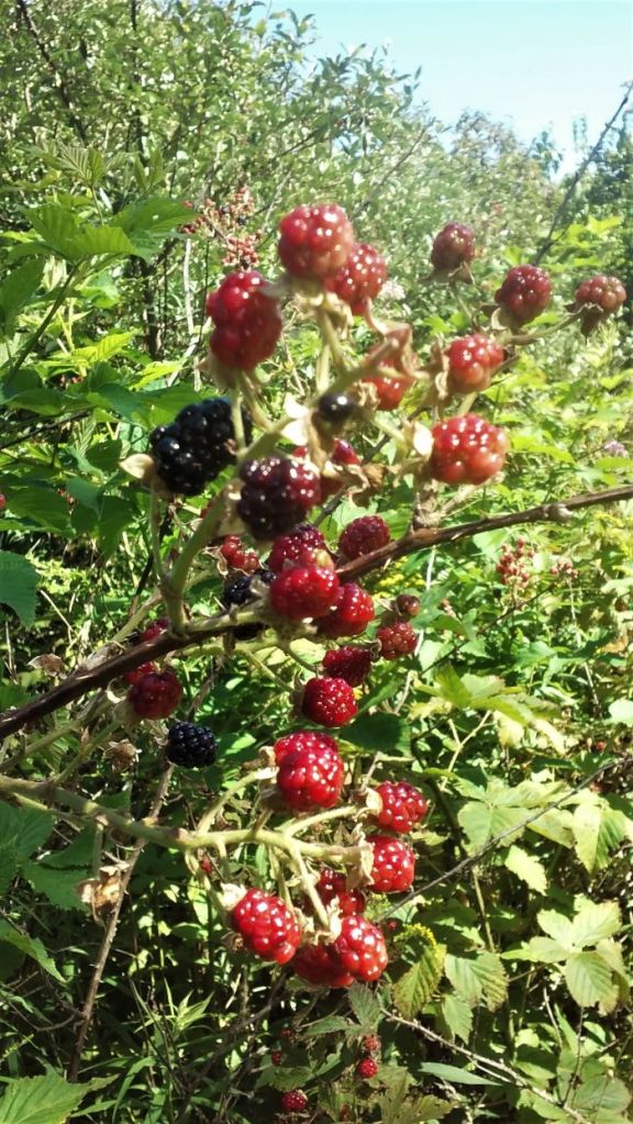 The blackberries: I pick a few as I ride by with the mower but have never gone out to pick volumes. To me too many seeds in them. There are also red raspberries out there but less of them. Those are my favorites.