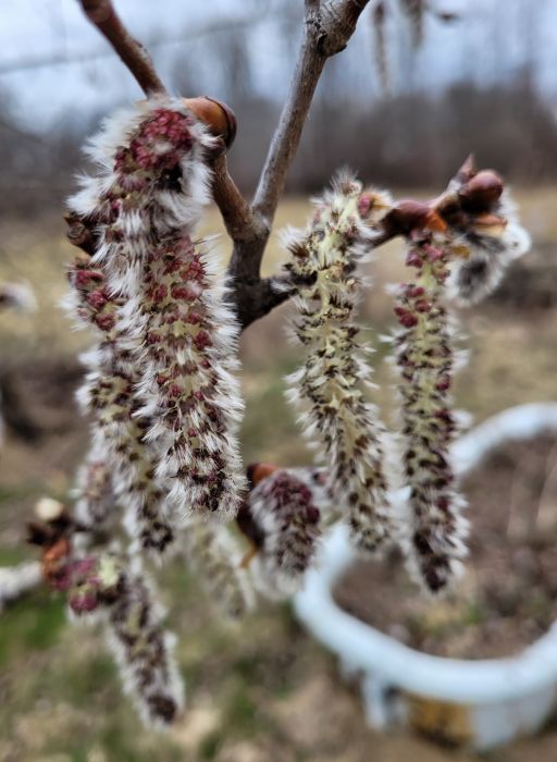 There were no cottonwood trees growing here when we moved here in 2011. We had some of what we thought were sycamore trees in pots and planted them. Both turned out to be cottonwood. They’ve grown very quickly. This pic was taken on 032925, where the catkins are out. Some people don’t like them because of their cottony snow, but I don’t mind it. They are beautiful trees and look at the catkins!