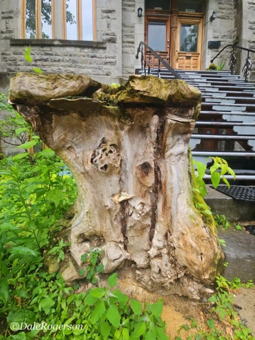 Note on writing process: the stump looks like a giant mushroom to me. I have read where fungi can absorb radioactivity and other toxins from the soil. From there, I imagined the MC being healed by fungi. I also wanted to include the lovely building and steps in the story. Great image to write to, Dale!