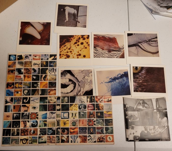The album package consists of 156 Polaroid photos that unfold into a 2×2 square. The Polaroid photos are seemingly random. One of the photos featured on the front cover is the eyeball of Dennis Rodman, former Chicago Bulls player and friend of the band, while another photo is of Vedder’s foot after he had been stung by a stingray. The pictures, when viewed from afar, blend to form the No Code triangle/eyeball logo that is the theme throughout the album. Later pressings of the CD featured a 1×4 format packaging, losing the hidden message effect. The CD and vinyl came with lyrics printed on the back of replica Polaroids. Only nine Polaroids came in a set, (with a catalog number Suffix of ‘C’ ‘O’ ‘D’ or ‘E’)leaving one to have to obtain another set to accumulate all thirteen songs.