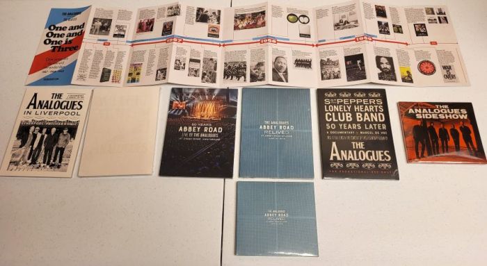 You know how it is when you happen across something or someone who strikes your fancy? The Analogues struck my fancy and I’ve gone back and listened to them on YouTube, watched the linked doc in the previous post, and otherwise stayed in their little box in my mind to pull out from time to time. A couple of weeks ago, they called to me and I went out for a few listens. I realized this group has given me so much enjoyment but I had yet to buy any of their excellent music from them – so went to their website. Looking at the reasonable price of their DVD’s, where live performance is what they are all about, I decided to buy 3 DVDs. Even though they were coming from The Netherlands, they arrived with lightning speed and came with the biggest surprise of all. A total of 7 items, including the ordered DVDs, a CD of one of the concerts, 2 documentary DVDs, AND … the happy news that The Analogues are continuing to make new music under the moniker, The Analogues Sideshow, with a CD of their new music. Guys, if you are reading this post, THANK YOU for going so much above and beyond with my order! Your music, whether recreating The Beatles or creating Beatles-inspired tunes, puts me in a happy place. A joy rises within and tears arrive, unbidden.  Keep making music, PLEASE!