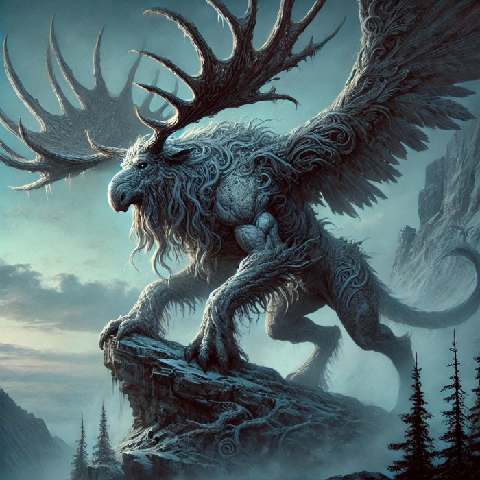 Pamola (also known as Pamolai, P-mol-a, Pomola, and Bmola) is a legendary bird spirit that appears in Abenaki mythology. This spirit causes cold weather. Specifically, according to the Penobscot tribal nation, Pamola inhabited Katahdin, the tallest mountain in Maine. Pamola is said to be the thunder god and protector of the mountain. The Penobscot people describe him as having the head of a moose, the body of a man and the wings and feet of an eagle. Pamola was both feared and respected by the Penobscot Nation, known as “The Oldest Government in the Western Hemisphere” per the Nation’s website, and his presence was one of the main reasons that climbing the mountain was considered taboo. The spirit resented mortals intruding from down below. Because of this, the mountain was closed off limits to all below. It was also widely believed that Pamola had taken and held prisoners on his mountain forever.
