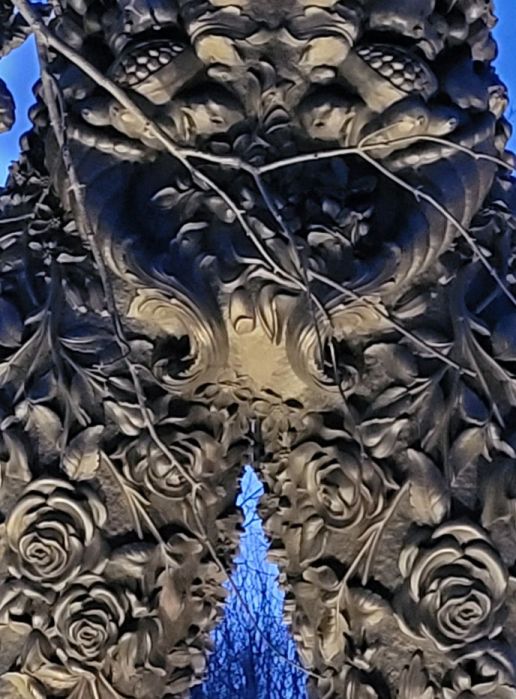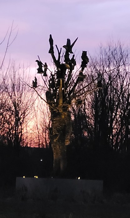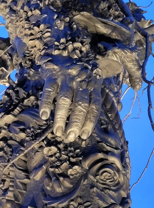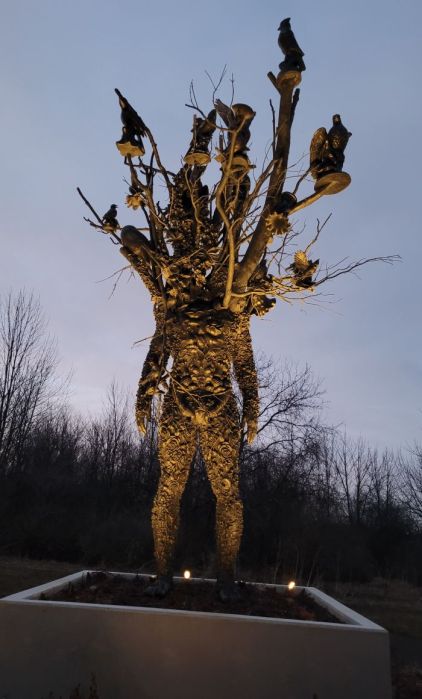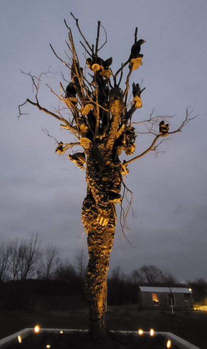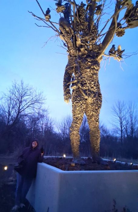 Happy Friday Everyone! Nick Cave’s magnificent sculpture has been installed at Meijer Gardens since fall, but they have had the area where it’s at blocked off because of various construction projects – and there are still large areas blocked off – so we were not able to see it until this past Tuesday. Because we didn’t get to the gardens until later and it still gets dark earlier, it was dusk by the time we got out there. Daughter-in-law and granddaughter decided to stay at the big playground area while son and I walked out there. It took awhile.