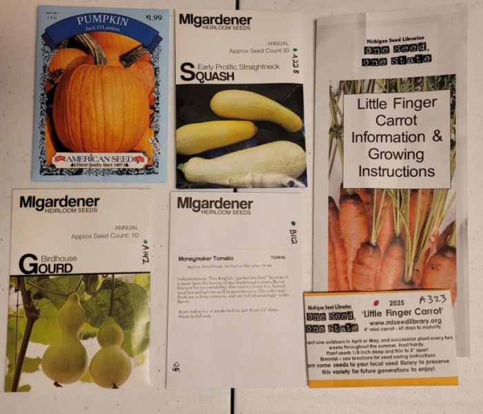 Fourth pic is of the free seed packets I picked up from the library seed bank. I have planted the birdhouse gourds and the tomatoes already. One gourd seed is sprouted. Speaking of birdhouse gourds, I’ll be seeing how the ones drying in the garage look soon.