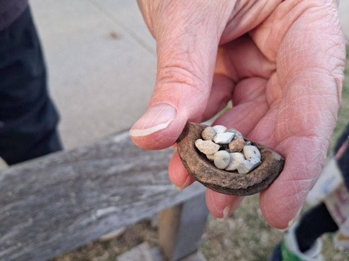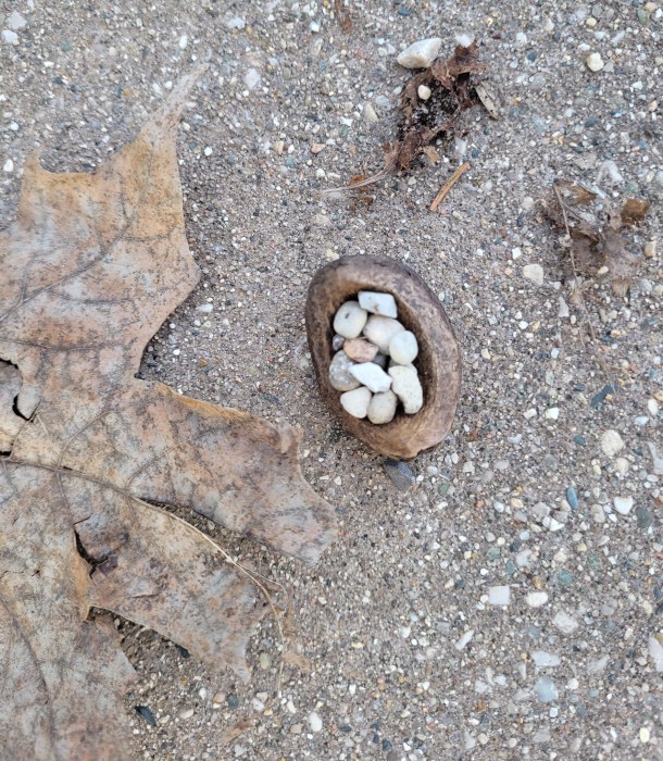 I saved the best for last. While resting on a bench, granddaughter was nearby, playing in gravel. She has an affinity for natural things and collects bits and pieces of it. After awhile, she came over, held out her hand, and said, “Gramma, come on over here.” She led me to a dead leaf. She said, “Gramma, pick up the leaf.” I did and under the leaf was her gift to me, a section of walnut shell filled with carefully chosen bits of gravel. I instantly started crying. She said, “Happy tears?” I said yes and I thought my heart would burst.
