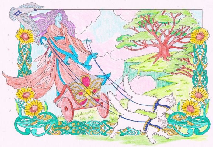 Freya’s occupying this role amongst the gods is stated directly in the Ynglinga Saga, and indirect hints are dropped elsewhere in the Eddas and sagas. For example, in one tale, we’re informed that Freya possesses falcon plumes that allow their bearer to shift his or her shape into that of a falcon.