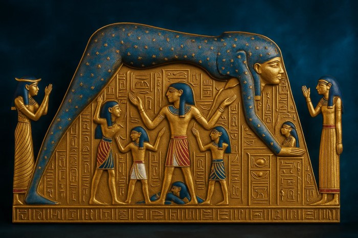 Nut was intimately associated with the afterlife. She was believed to shelter and rejuvenate the souls of the dead within her star-spangled body, offering them the possibility of rebirth. Stars were thought to be the souls of the dead or, in some interpretations, droplets of milk from Nut’s udders. This reinforced her role as a nurturer and caretaker, with the Milky Way itself serving as a representation of her nourishing abundance. The ceilings of many tombs in the Valley of the Kings were adorned with images of Nut, intended to ensure the protection of the deceased’s soul.