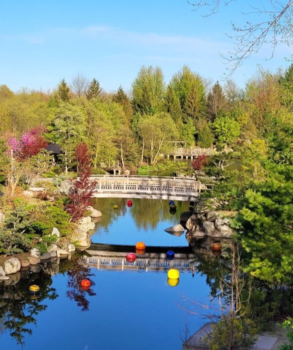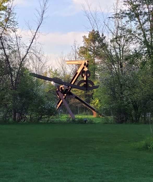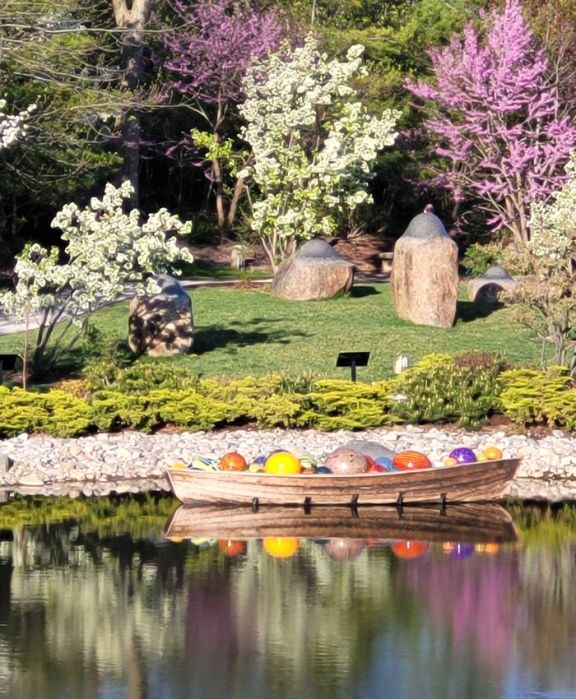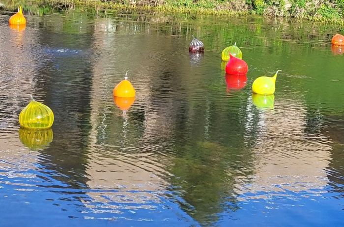 See Nick Cave’s Amalgam in the distance.Japanese Garden bridge with Chihuly baubles in pondChihuly baubles in pondChihuly BaublesChihuly boat docked at cherry orchardChihuly flowersChihuly grass on hillGranddaughter’s Good Luck Basket to GrammalisaLena Meijer farmhouse to scaleclose up of Neuron by Roxy PaineScarlotti by Mark di Suverowindmill at Lena Meijer farm